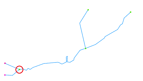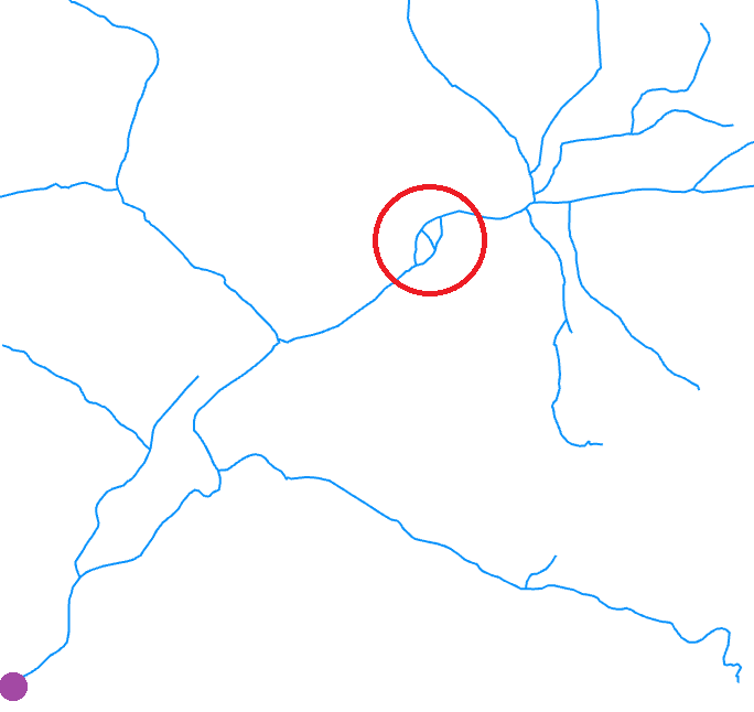 The red circle identifies a multi-thread section creating a loop, purple point is the mouth of the network. Your network may